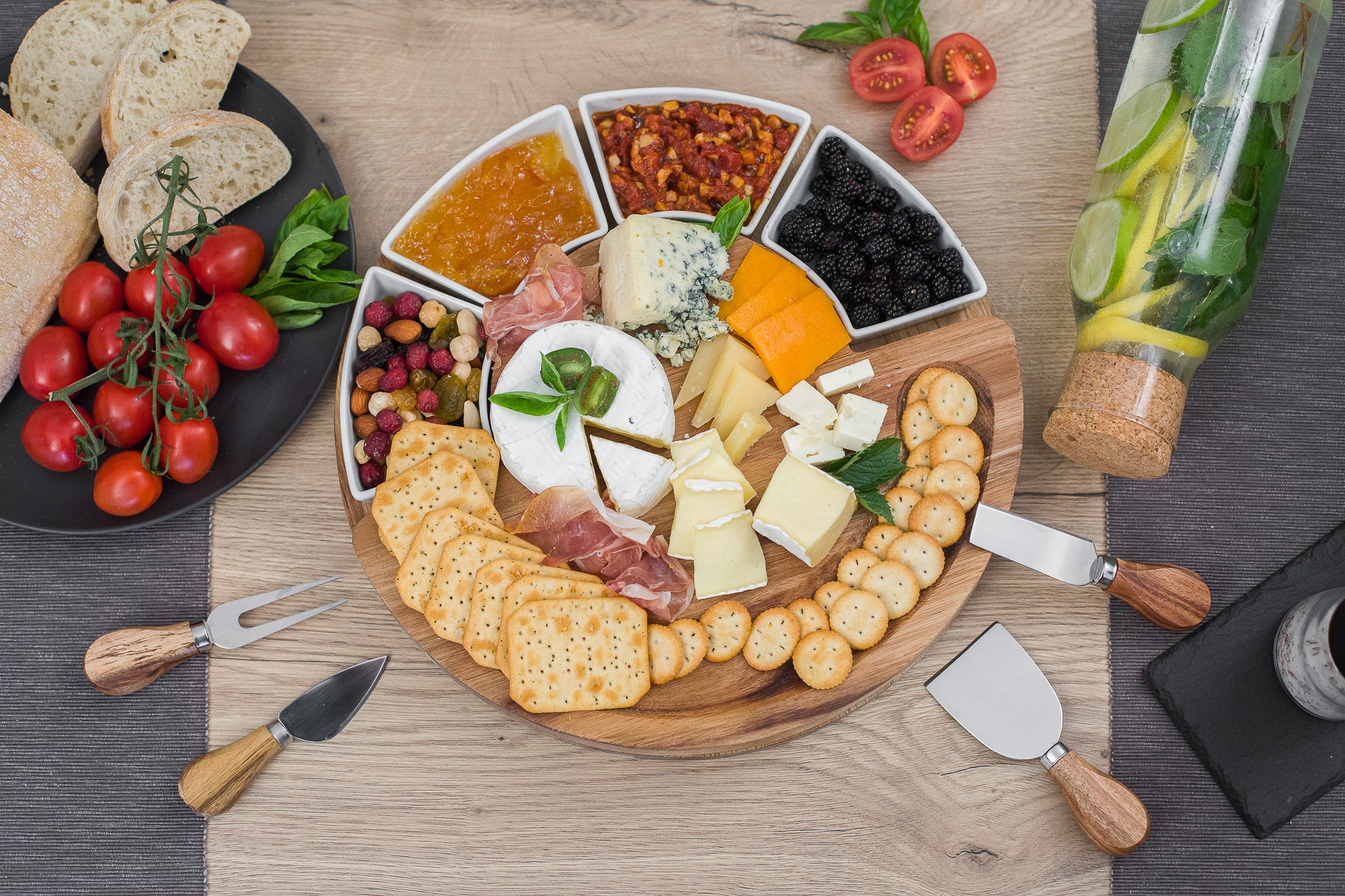 Thanks to its wide 13 inches diameter, this acacia wood cheese cutting tray has all the room you'll need for crackers, serving utensils and cutlery for your cheese and meat.